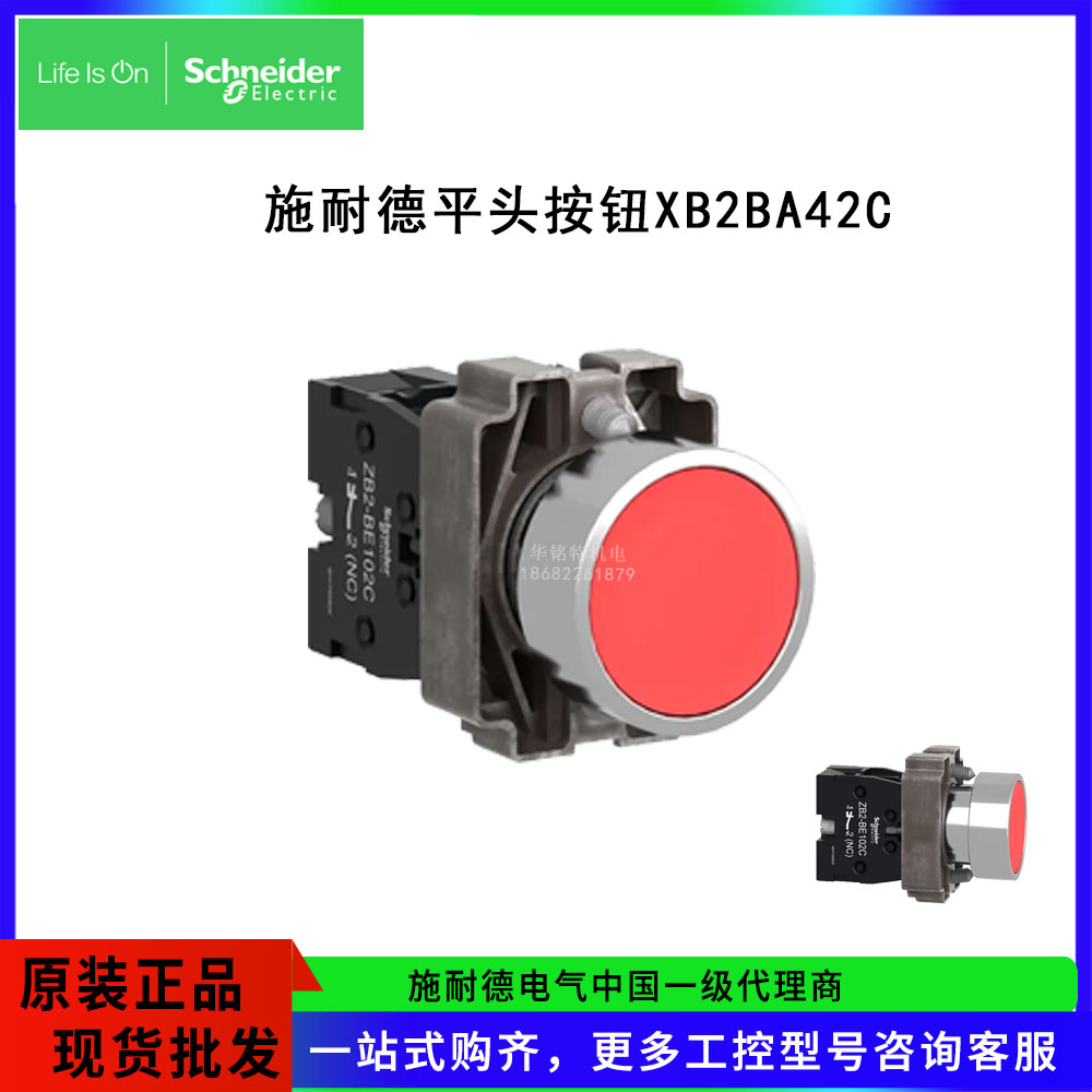 Schneider/施耐德電氣XB2B平頭按鈕XB2BA42C是一款彈簧復位,安裝直徑22mm輔助觸點1NC的紅色平頭按鈕,XB2BA42C=ZB2BZ102C+ZB2BA4C。